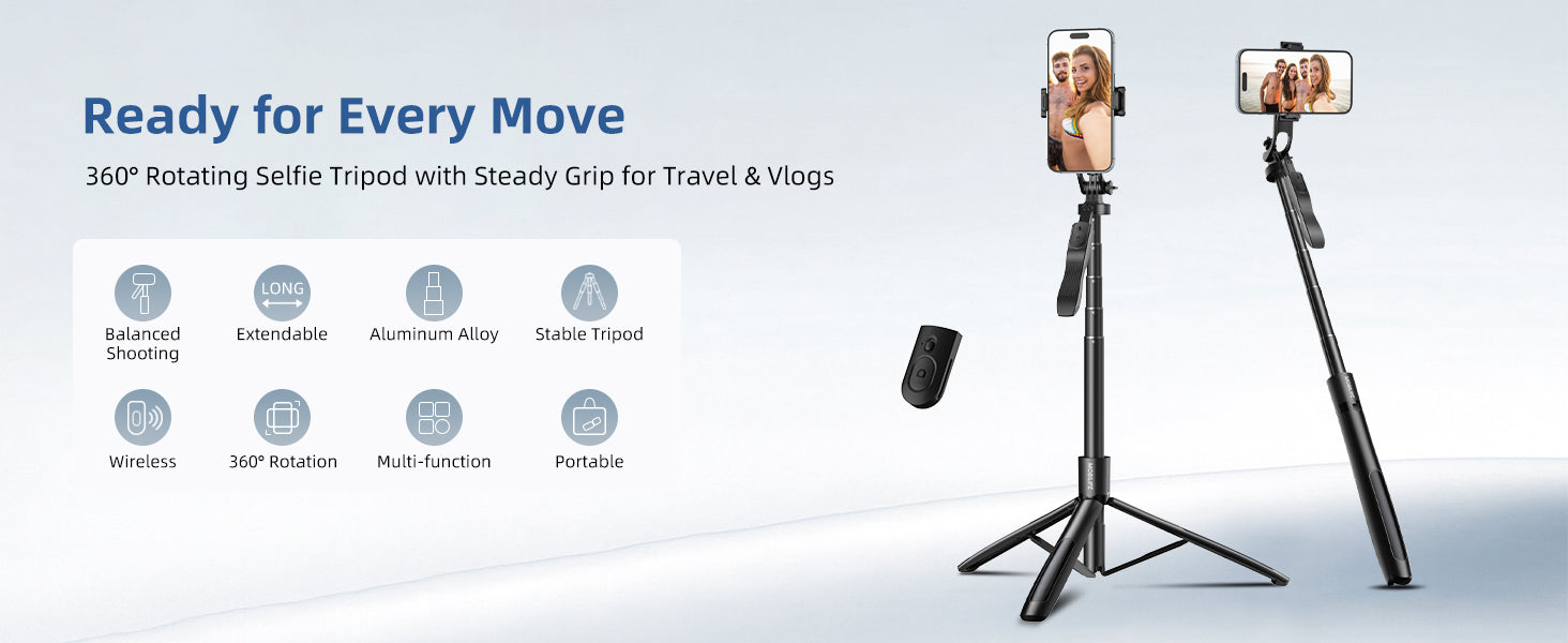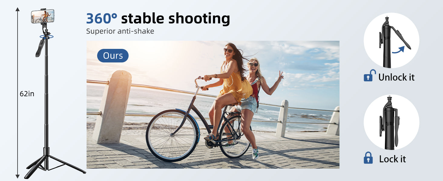 - [Extended 62" Reach for Every Angle]- Adjustable from handheld size to a full 62 inches, this selfie stick tripod lets you capture wide shots, group photos, and travel moments effortlessly. Perfect for both indoor and outdoor shooting.