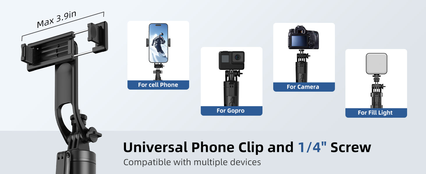 - [Wide Compatibility for Phone, Camera & GoPro]- Universal phone mount fits most smartphones,and the universal 1/4" Screw fits mirrorless cameras, and action cameras like GoPro. Perfect for travel, vlogging, selfies, and content creation.