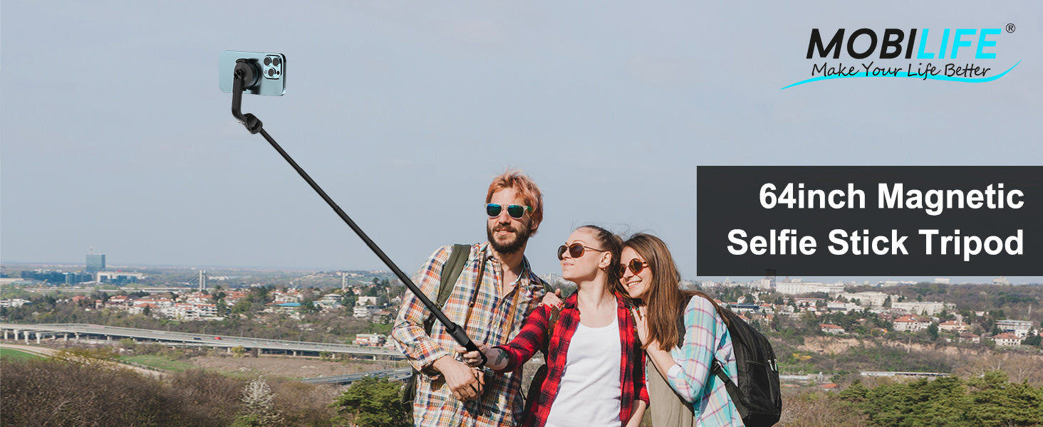 Mobilife Magnetic Selfie Stick Tripod 64" Long Tripod Stand for Magsafe iPhone 360 Degree Rotation for Camera, gopro etc.,