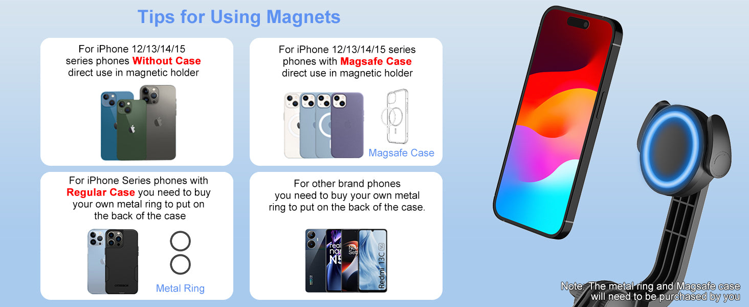 - [Magnetic Mobile Holder]-- The MLSS012 selfie stick comes with a powerful magnetic holder that works well with iPhones 12 and above. Makes it easy for you to mount and remove the iPhone from the mobile holder. For other cell phones you can buy a magnetic ring to use the magnetic mobile, or you can use a spring clip to hold your cell phone. Discontinue this selfie stick can be well fit a variety of cell phones.