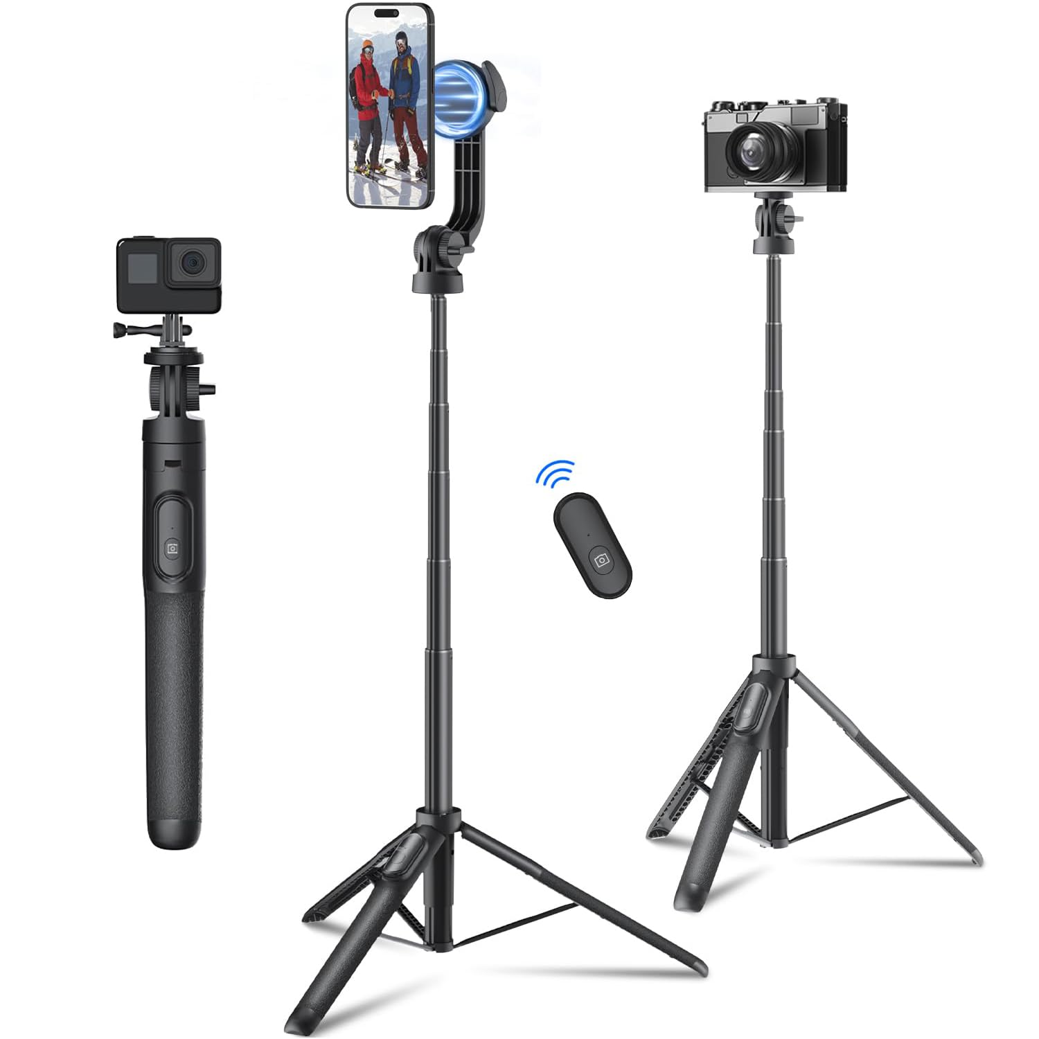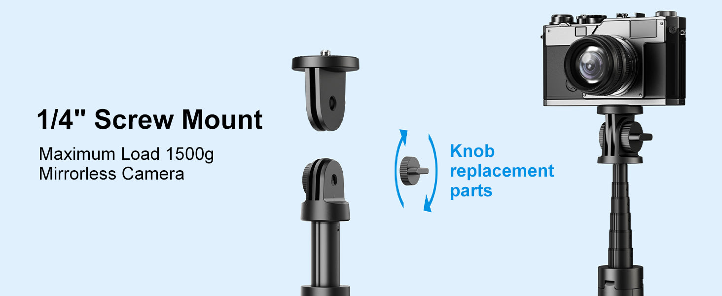 - [Multiple Detachableable Camera Holder]-- Comes with several accessories including magnetic cell phone holder, Gopro holder, 1/4" screw. Both handheld mode and tripod mode can be well fit cell phone, gopro, mirrorless camera and ring light. NOTE - Bluetooth remote can only connect to your cell phone to control your cell phone to take photos and videos, it can't be used for camera and Gopro.