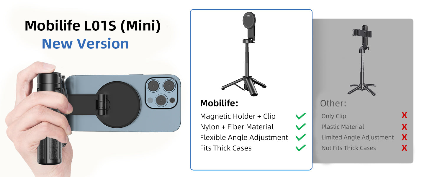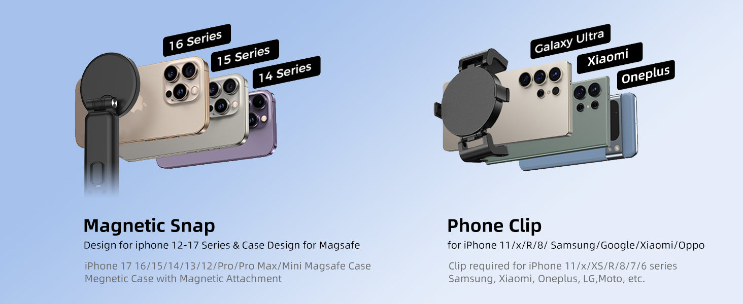 - [Strong Magnetism, High-grade Material]- The mobile tripod comes with a magnetic holder, which is very strong and safe and can be directly fitted to iPhone 12 and above. We also provide magnetic rings for other mobile phones to fit to the magnetic holder. Adsorption in one second, convenient and fast.