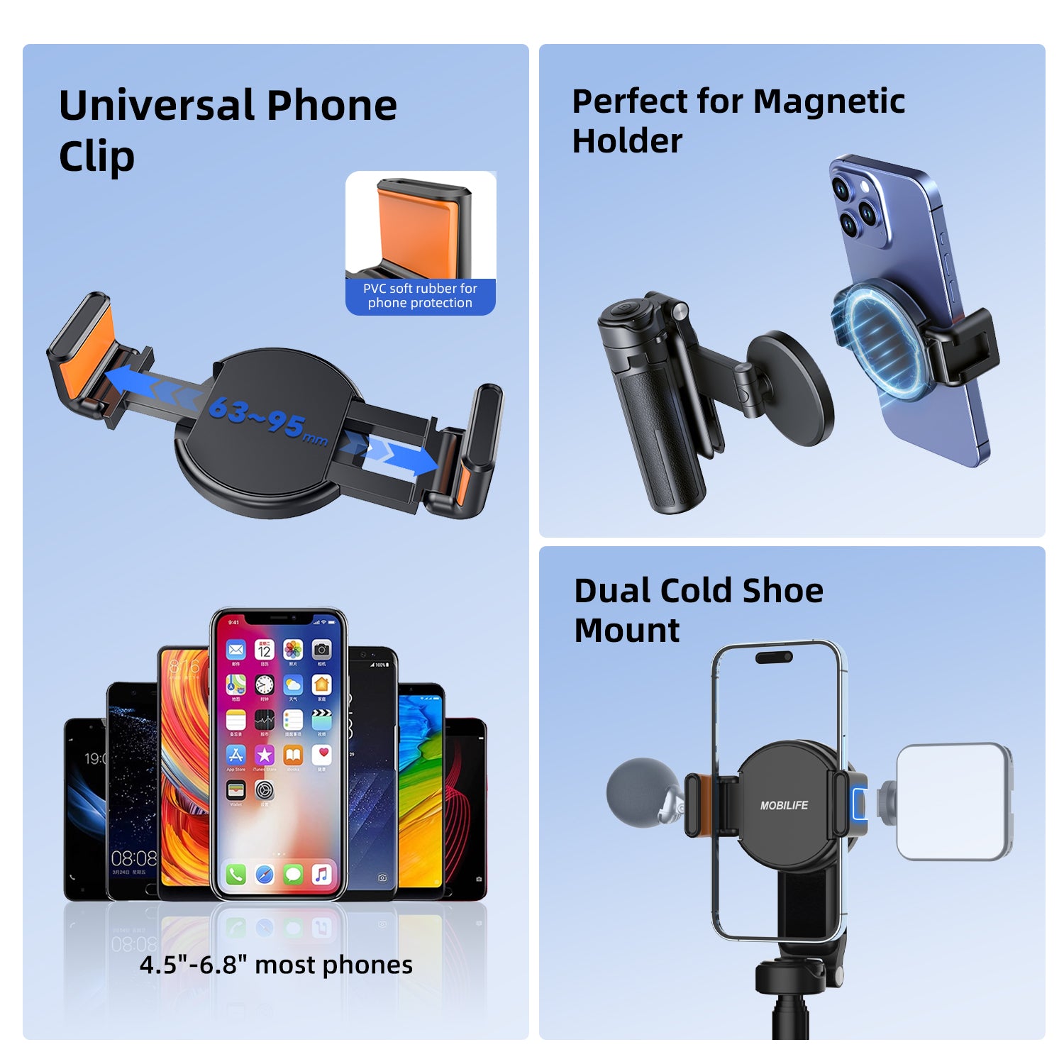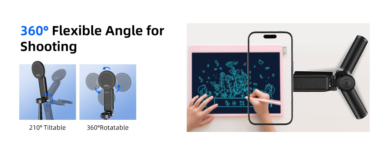 - [Compatible with Multiple Device]- Comes with a separate mobile phone holder, it can be directly used for most iOS/Android mobile phones. And the phone clip have two cold shoe, which can be adapted to fill light, microphone and other equipment.