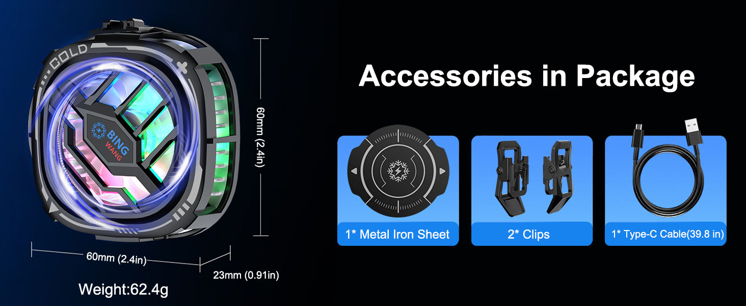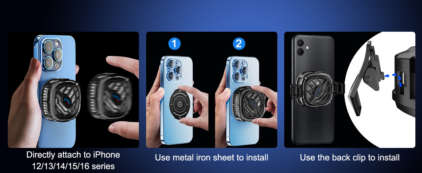 - 【Magnetic Mobile Cooler】Our mobile cooler built-in strong magnetic adsorption, directly attach to iPhone 12/13/14/15/16 series. For other phones: 1.Use a clip. 2. Use a metal iron sheet(not suit for phones with back curved). Note:Remove the phone case before install.