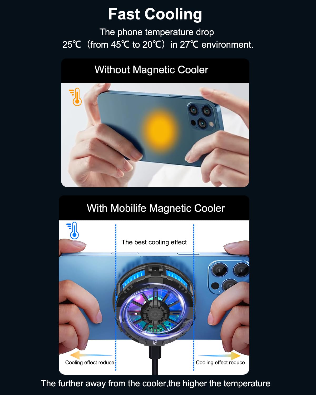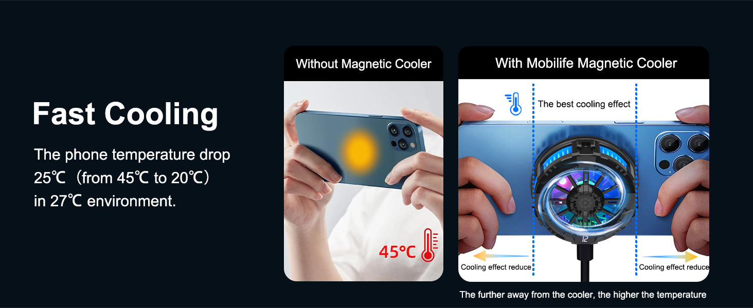 - 【Fast Cooling Phone Cooler】- The mobile cooler for gaming use advanced cooling technology(semiconductor refrigeration), provides 5000rpm/min high-speed gear heat dissipation. The phone temperature drops as much as 25°C in 30 minutes. LCD temperature display provide visible temperature change.