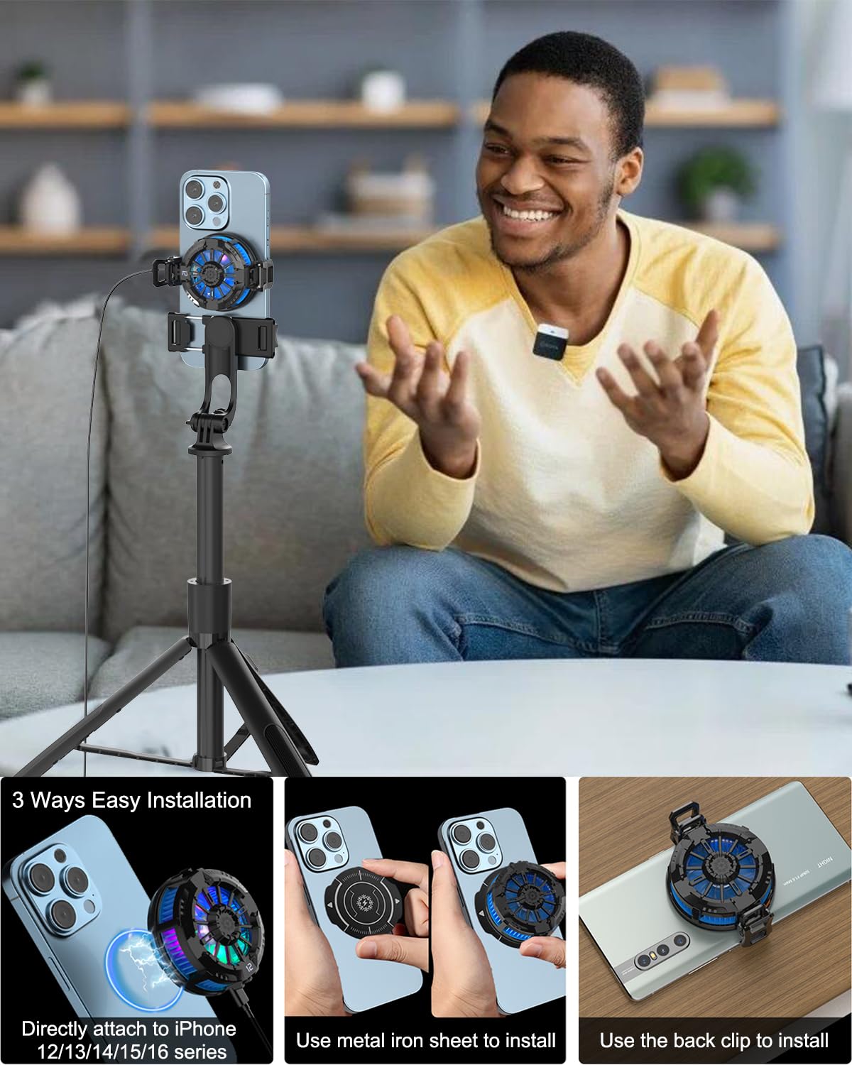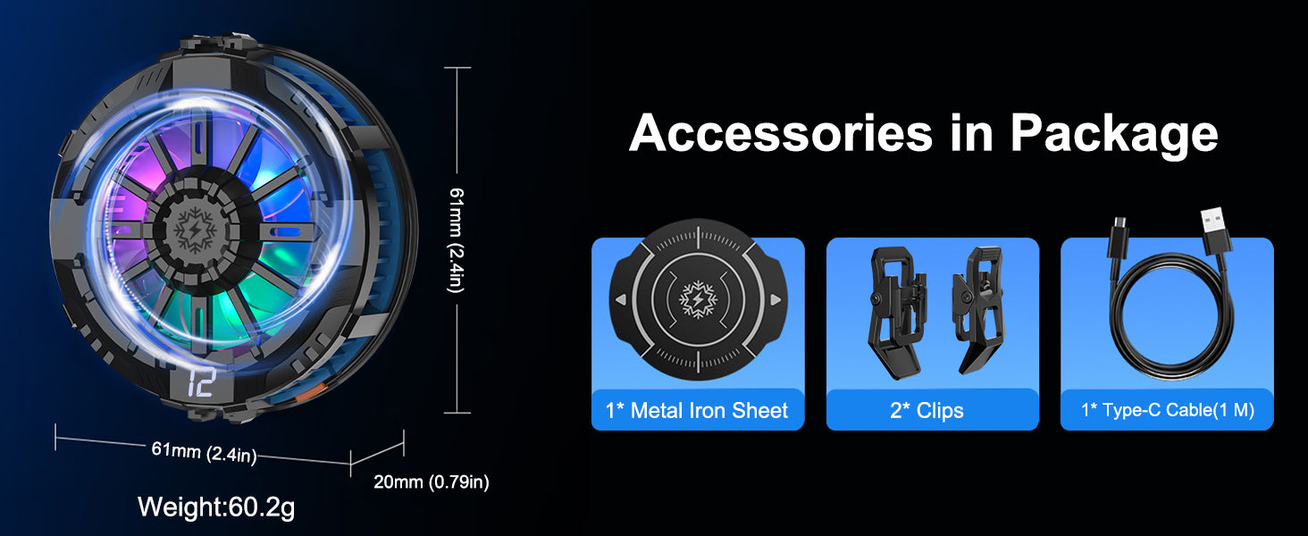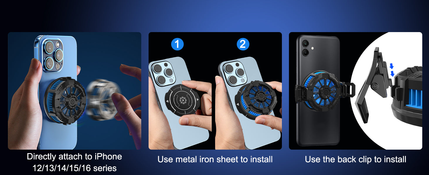 - 【Magnetic Phone Gaming Cooler】- The gaming cooler built-in strong magnetic adsorption, seamlessly compatible with iPhone 12/ 13/ 14/ 15/ 16 series. For other phone don’t have magnetic attraction, two ways easy to install. 1. Use metal iron sheet.(not suitable for phones with back curved) 2. Use clips.(package included).