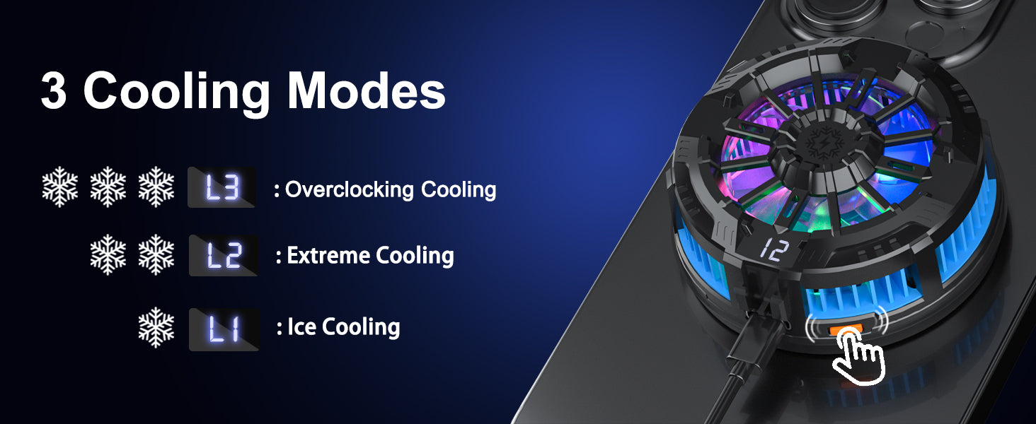 - 【Three Modes Gaming Cooler】- One switch with 3 cooling modes. Plug the mobile phone cooler into power, come with maximum cooling mode-overclocking cooling(L3); medium cooling mode-extreme cooling(L2); low cooling mode-ice cooling(L1). LCD display provide visible cooling mode change.