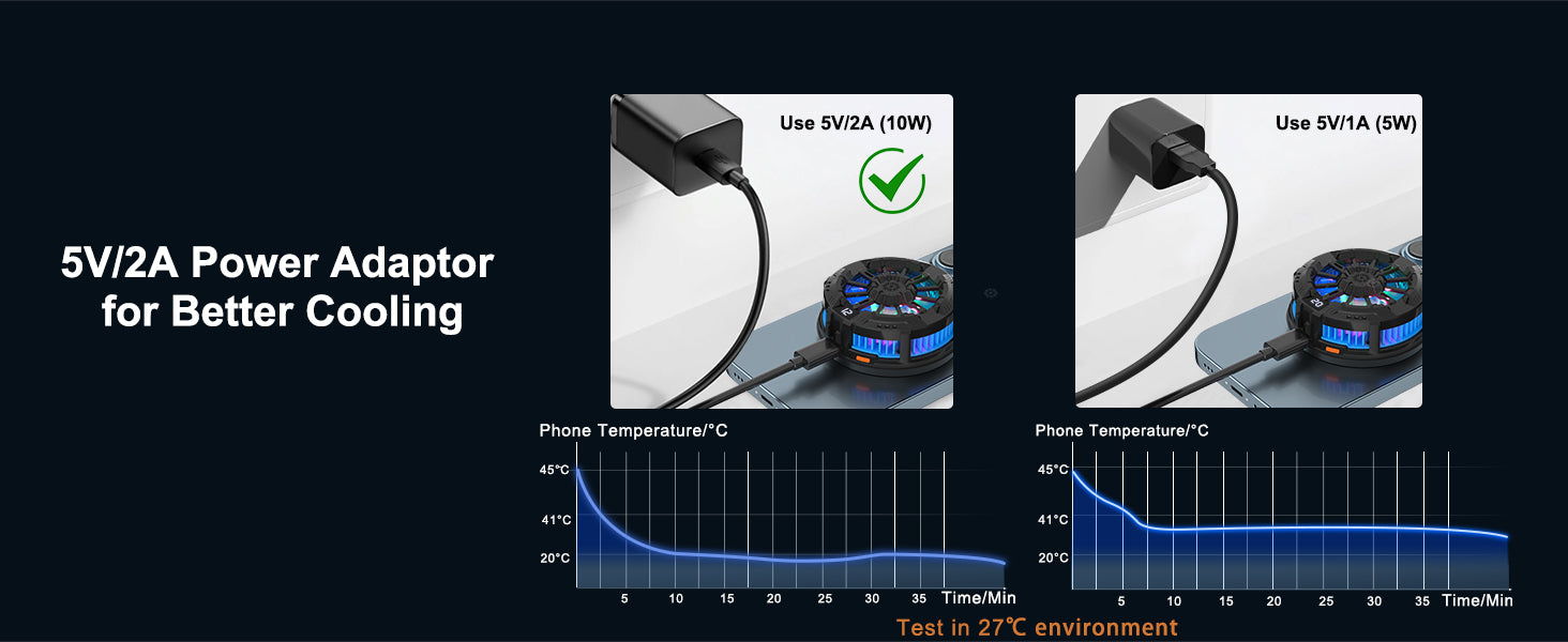 - 【NOTE】5V/2A (10W) power adaptor for a Better Cooling, the phone cooler works for more than 10 minutes, and the temperature displayed on the cooler tends to stabilize.