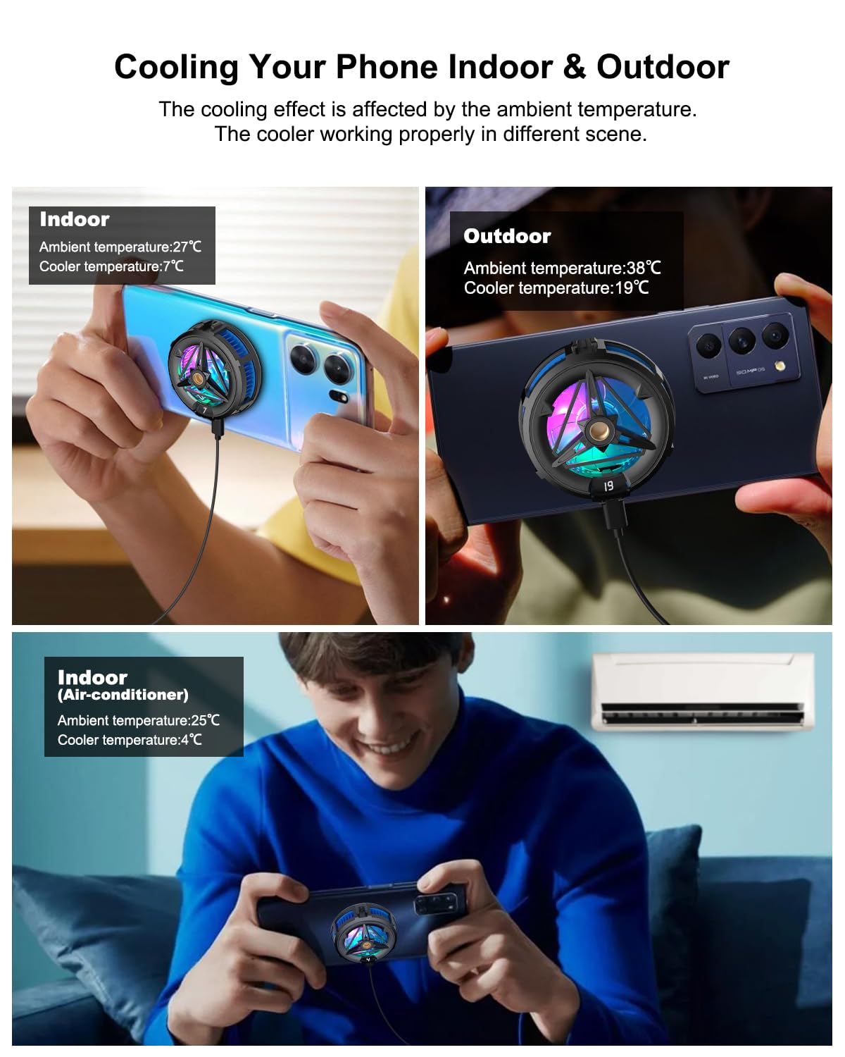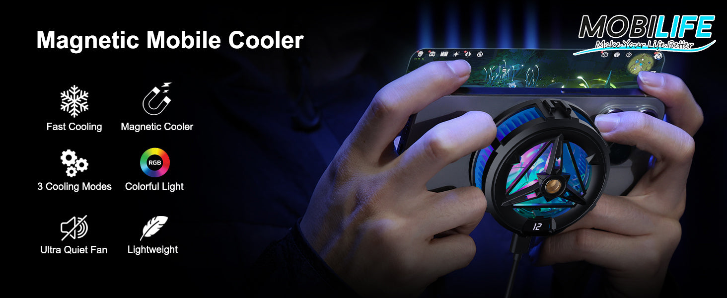 - 【Super Quiet Cooler for Phone】The phone cooling fan operates quietly, noise lower than 35dB, ensure a more comfortable experience for gaming, video-watching. Also this phone cooler gaming fan has colorful RGB light, which create a better gaming atmosphere.