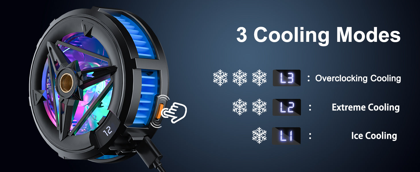 - 【Three Modes Mobile Cooler】The mobile cooler for gaming has 3 cooling modes for your choice. Connect type-c cable(included) to power port, press the switch: 1st mode(L3)-overclocking cooling; 2nd mode(L2)- extreme cooling; 3rd mode(L1)-ice cooling. Design with LCD temperature display, clear temperature and mode change.